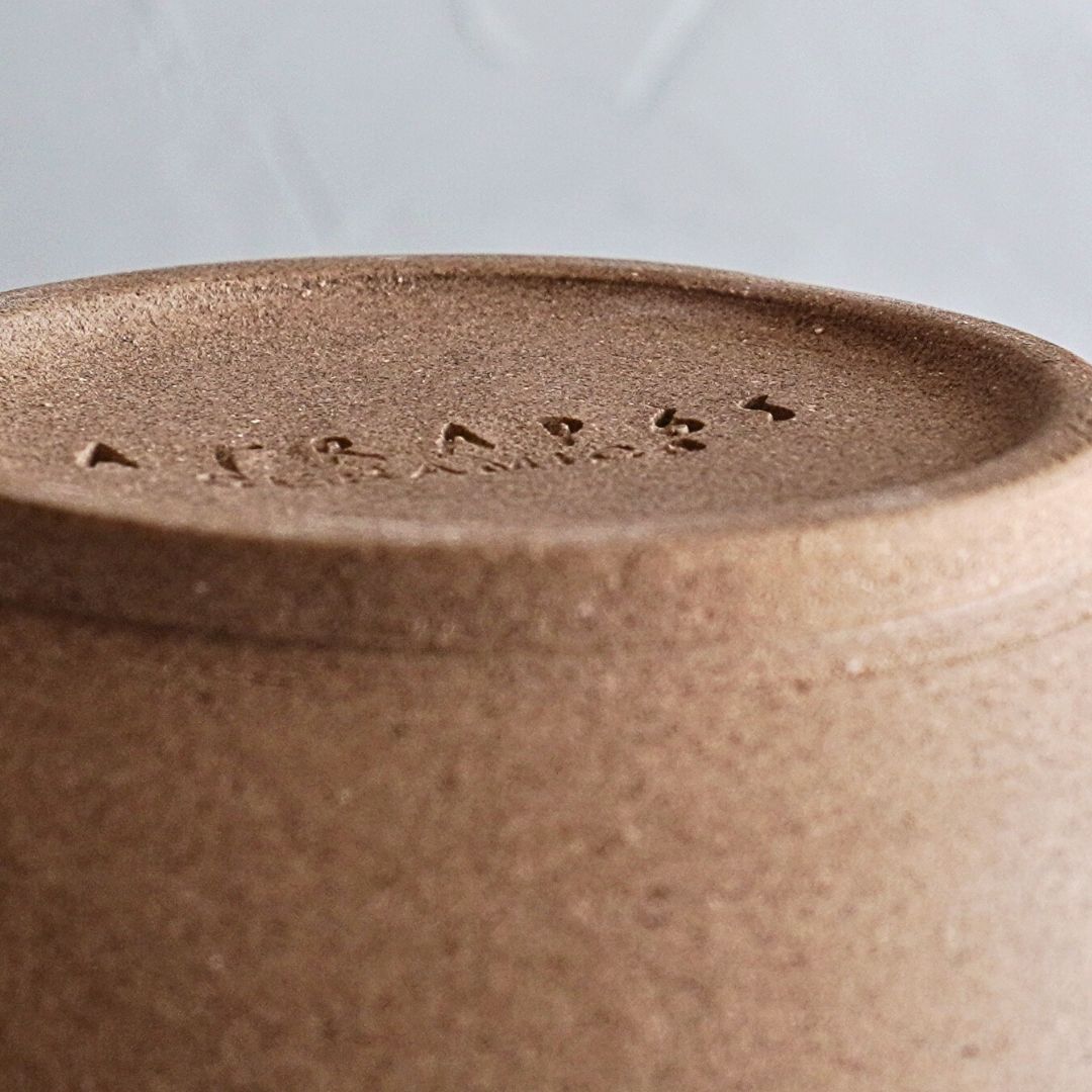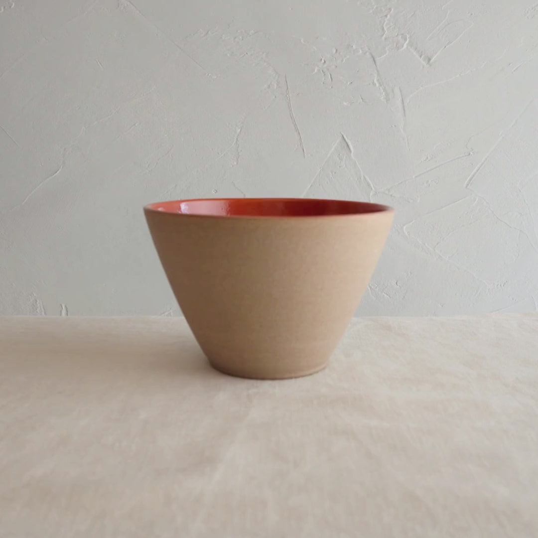 Un grés caramello lasciato grezzo all’esterno per mantenere l'effetto materico, acceso dal contrasto del colore interno, caldo e luminoso. Questo pezzo parzialmente grezzo regala una sensazione tattile che sorprende ogni volta che lo si usa.
