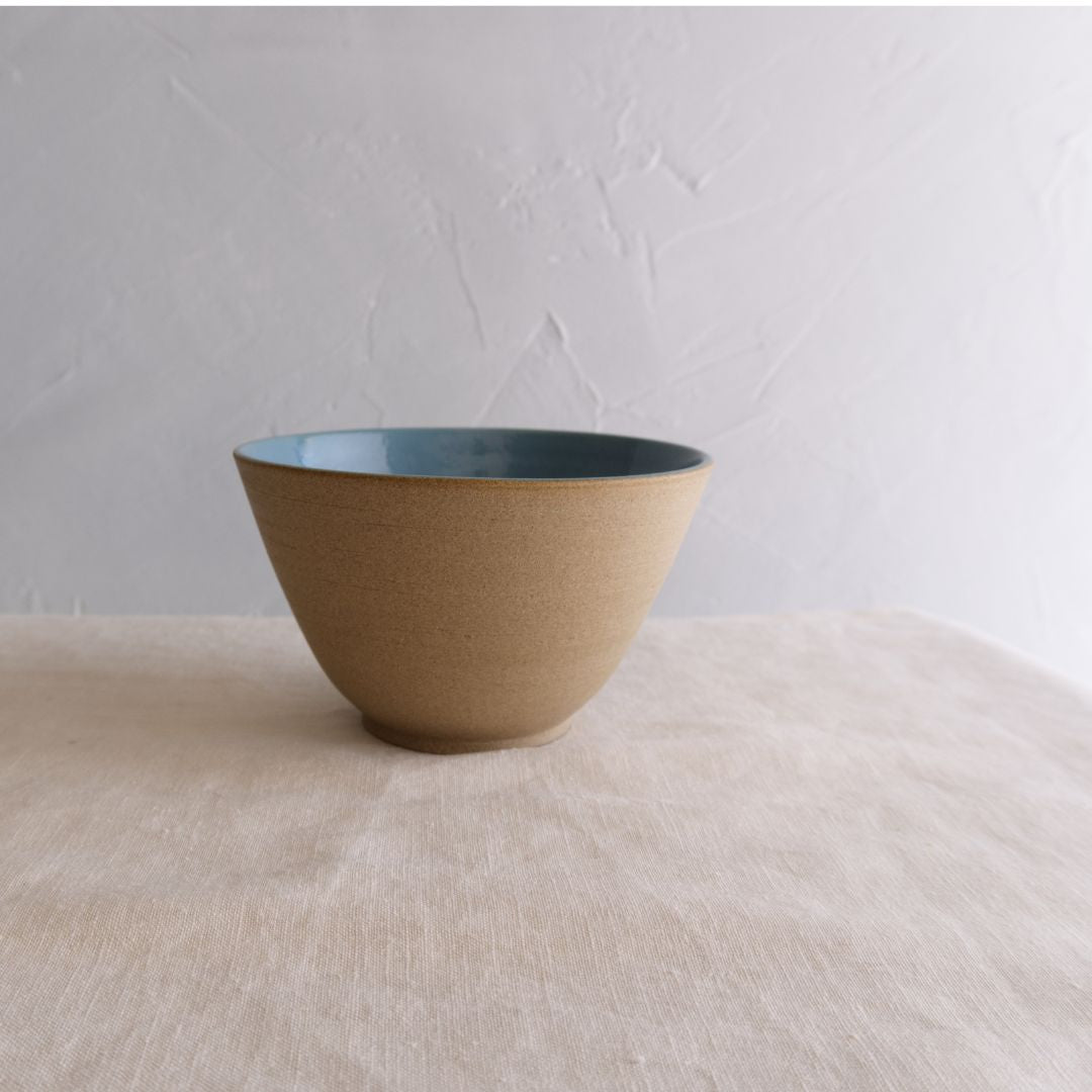 Un grès caramello lasciato grezzo all’esterno per mantenere l'effetto materico, acceso dal contrasto del colore interno, caldo e luminoso. Questo pezzo parzialmente grezzo regala una sensazione tattile che sorprende ogni volta che lo si usa.