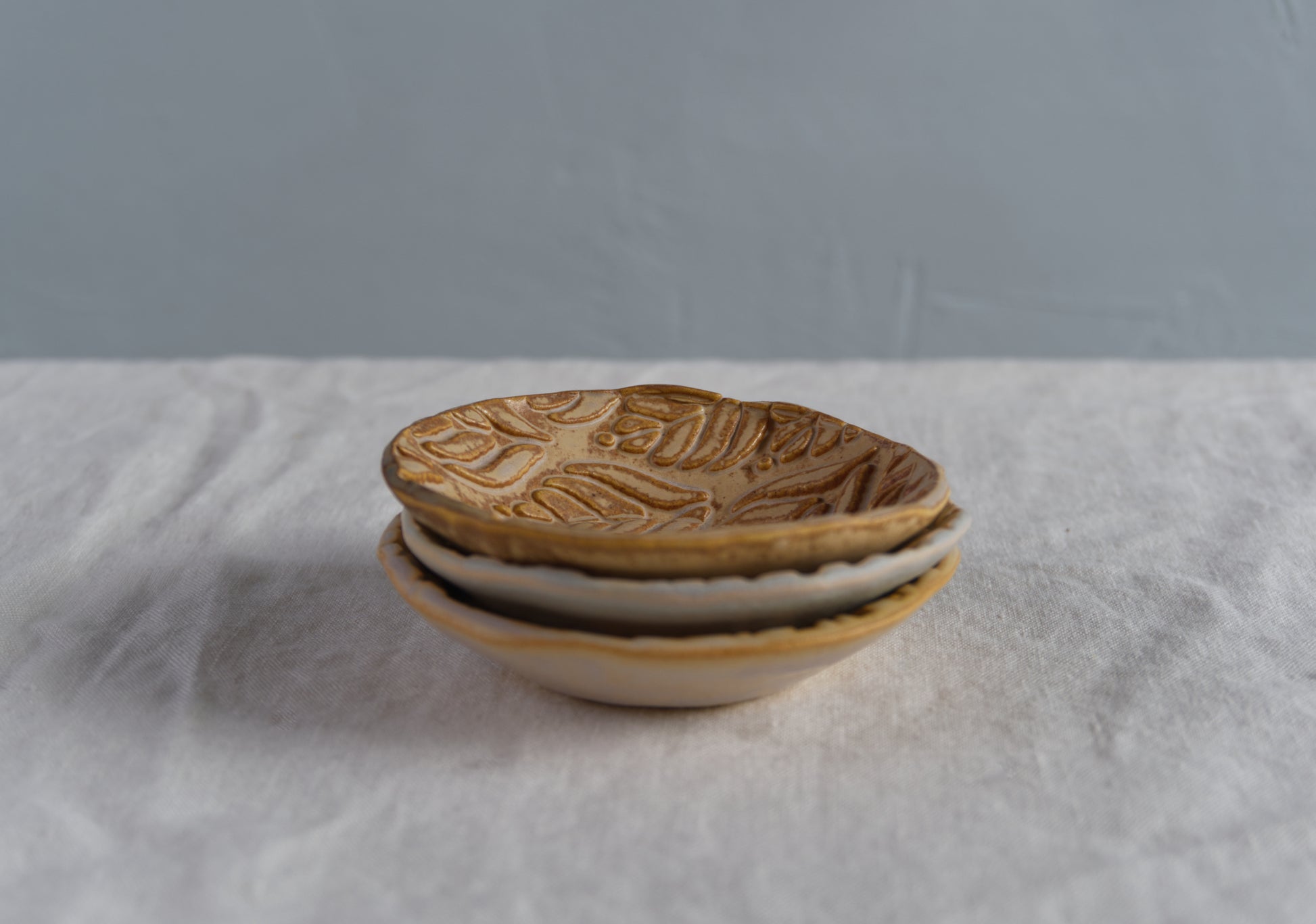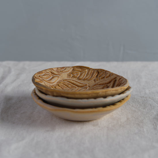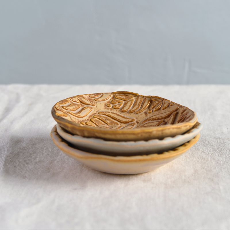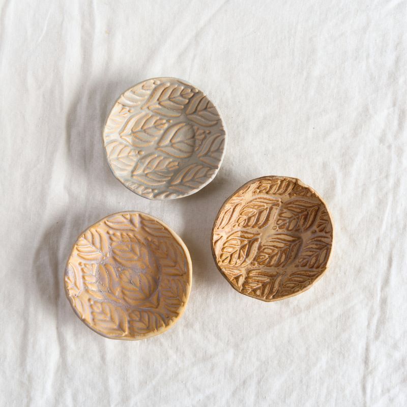 Questi piattini portano con sé la stessa essenzialità del rito da cui prendono il nome. Sono pensati per accompagnare i vostri momenti in compagnia, per servire in tavola salse, formaggi e assaggi caldi e freddi: ogni pezzo è realizzato a mano con un motivo naturale inciso a foglia, con interessanti sfumature di colore.